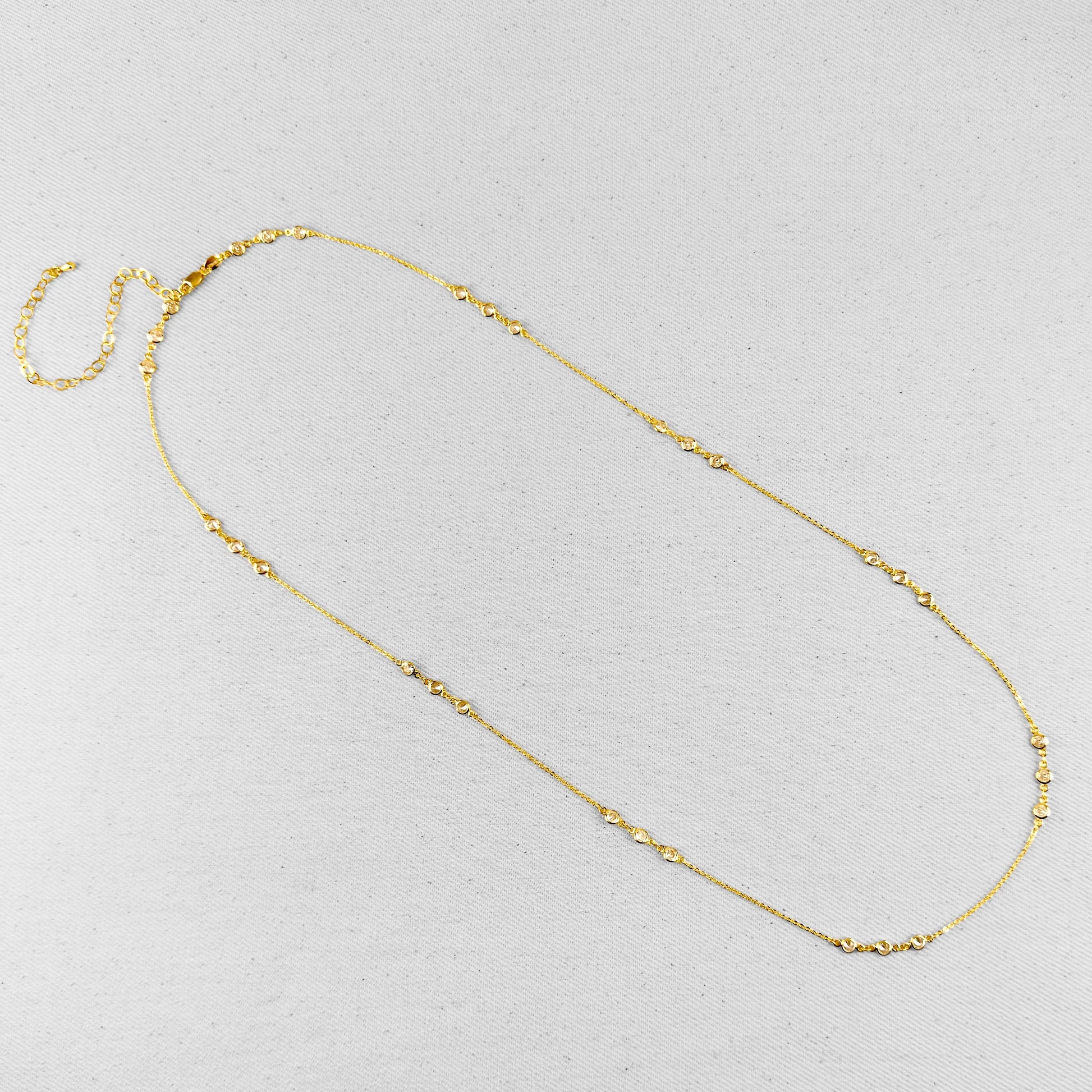Celebrate your beautiful silhouette with this elegant body chain that brings subtle sparkle to your style. Delicate bezel-set cubic zirconia stones are strategically placed along a fine chain, creating gentle shimmer that catches light with graceful movement—refined, alluring, and effortlessly chic.