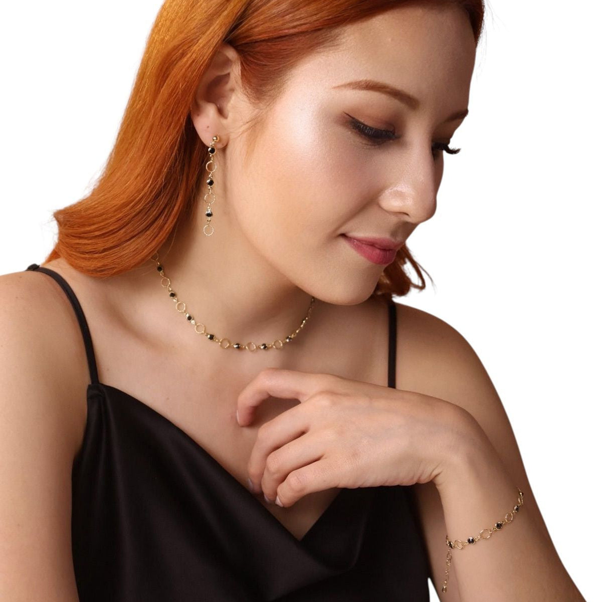 - Sophisticated Contrast - Black CZ stones against warm gold create versatile, chic style