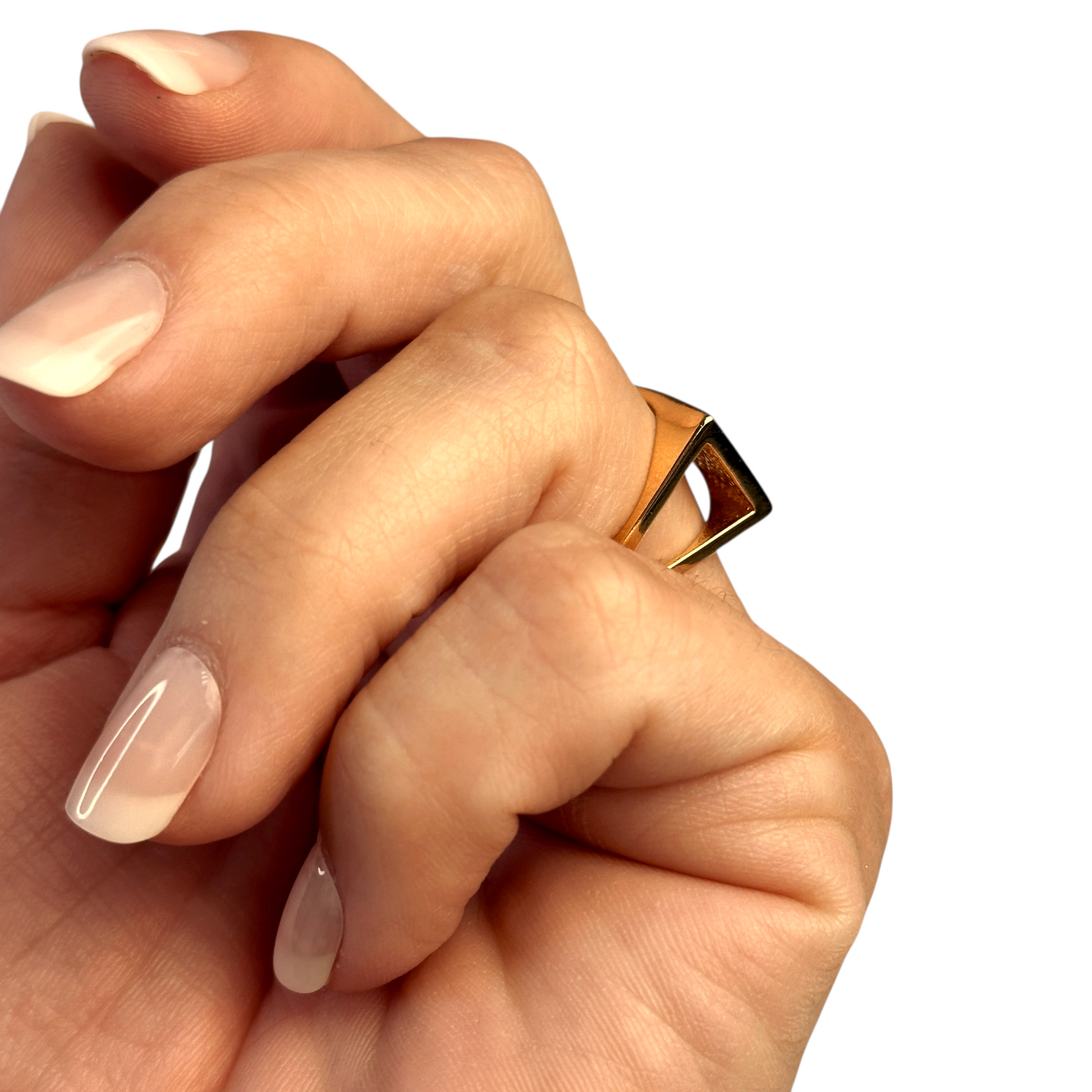 Wear art on your finger. This striking triangle ring features a pavé surface of premium cubic zirconia atop an architectural silhouette—bold, modern, and impossibly chic. This is the ring that turns heads without saying a word.