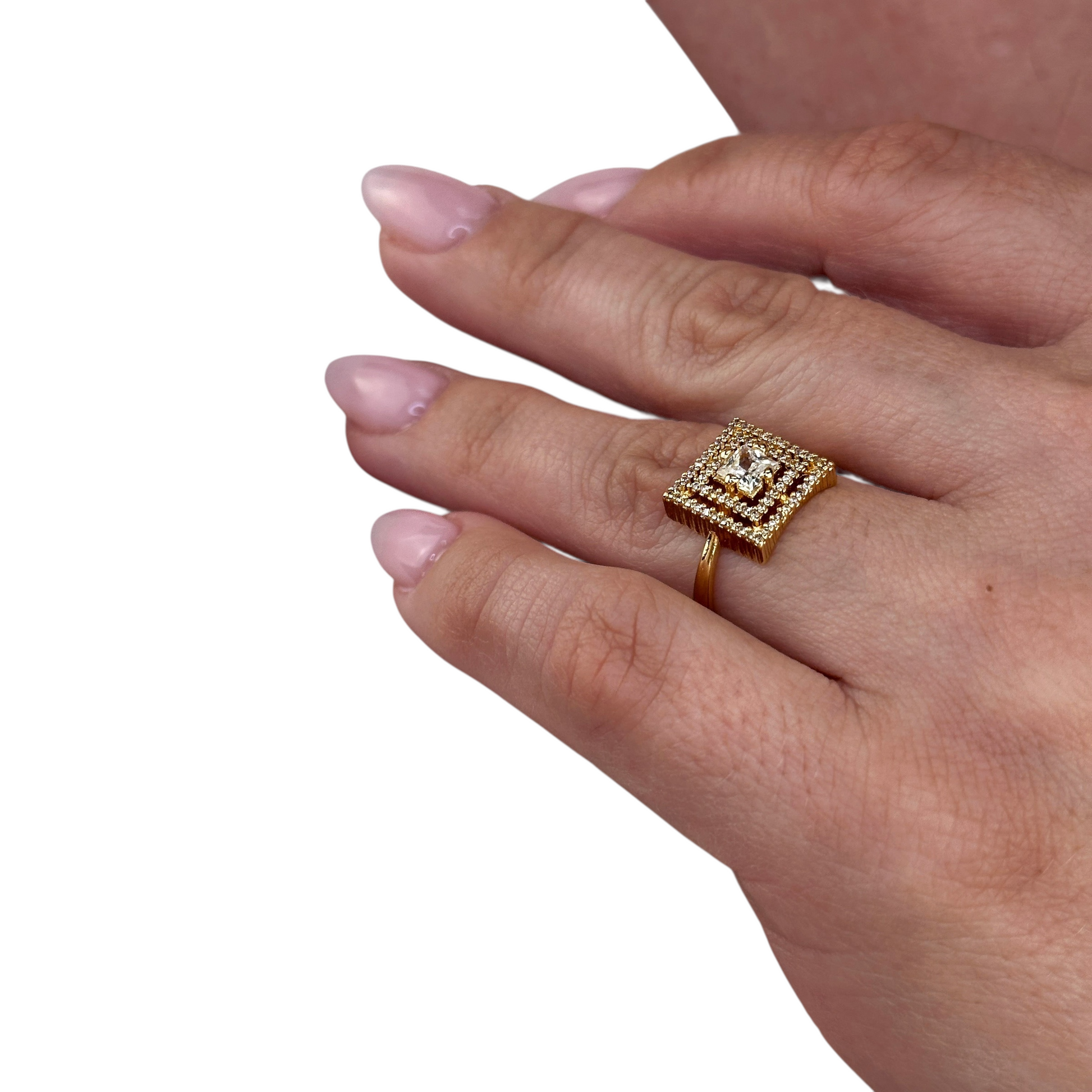 Center stone, double the sparkle. This stunning ring features a princess-cut cubic zirconia framed by two rows of pavé stones—a classic double halo design that maximizes brilliance from every angle. The geometric square shape adds modern edge to timeless elegance.