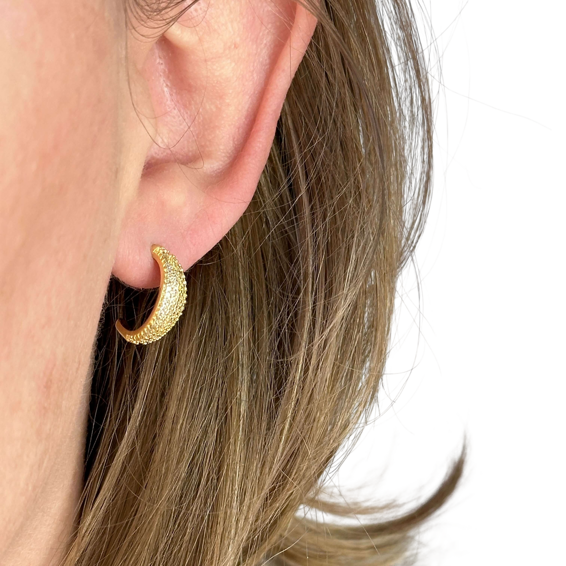 Delicate curve, brilliant detail. These elegant earrings feature a graceful arc adorned with micro cubic zirconia stones—a modern silhouette that hugs your earlobe with sparkling sophistication. Subtle enough for everyday, stunning enough to stand out.