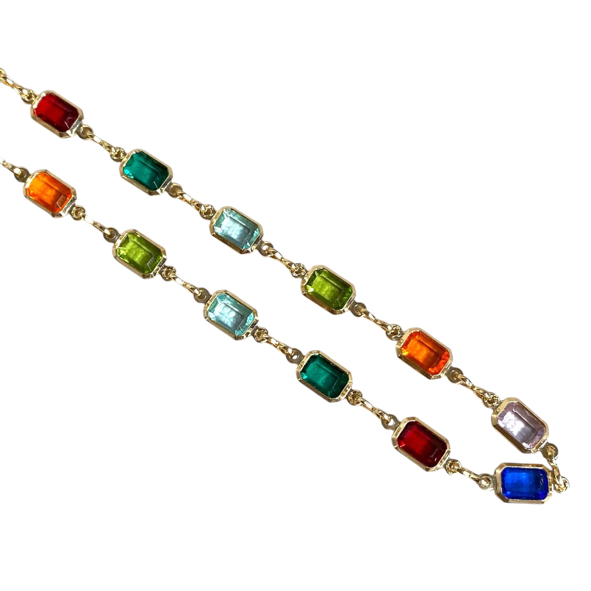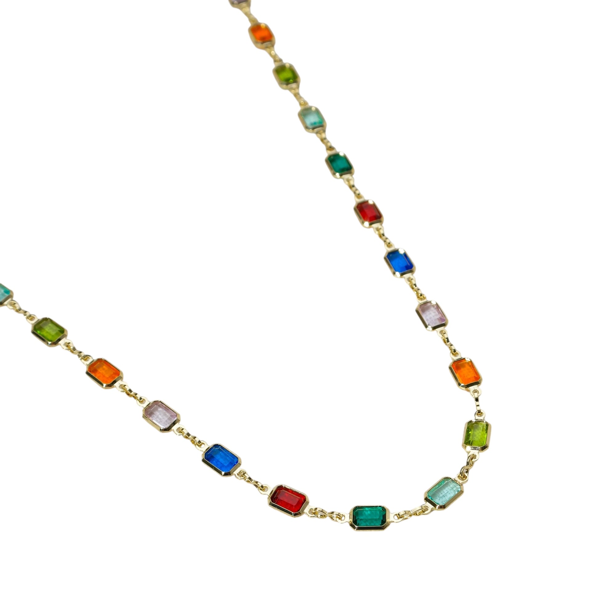 Why choose one color when you can have them all? This station necklace brings jewel-toned color stones in every shade of joy—vibrant blues, rich greens, warm oranges, deep reds, soft pinks. Each rectangular stone sits in its own bezel setting, connected by delicate chain that lets the colors dance around your collarbone. Plus, that thick open-link extender? It's a design detail worth showing off.