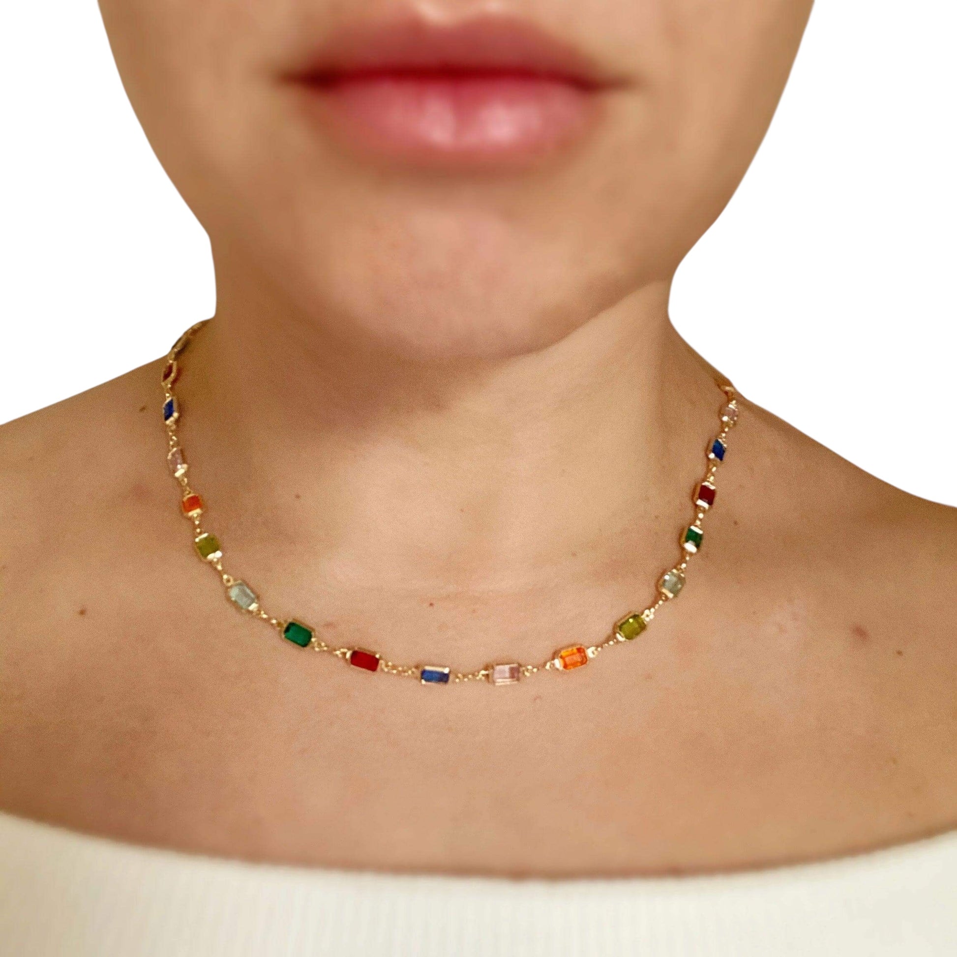 Color Stones Station Necklace - 18K Gold Filled - Rainbow Elegance, Modern Joy