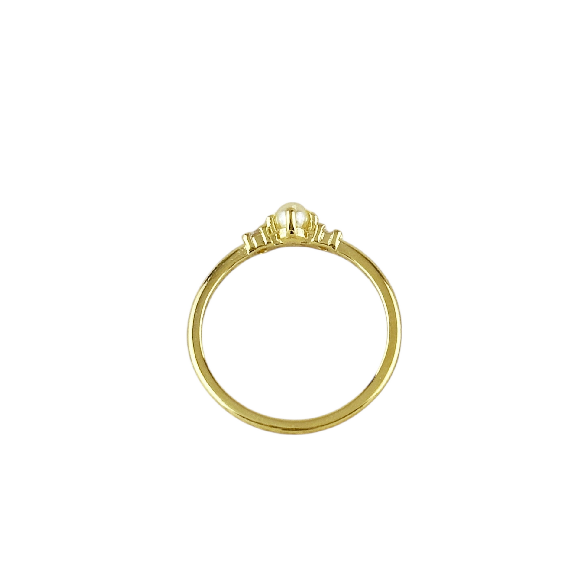 Timeless elegance, modern sparkle. This delicate ring features a luminous center pearl flanked by two brilliant cubic zirconia stones—the classic three-stone design reimagined with understated glamour. The slender gold band keeps everything refined and comfortable for all-day wear.