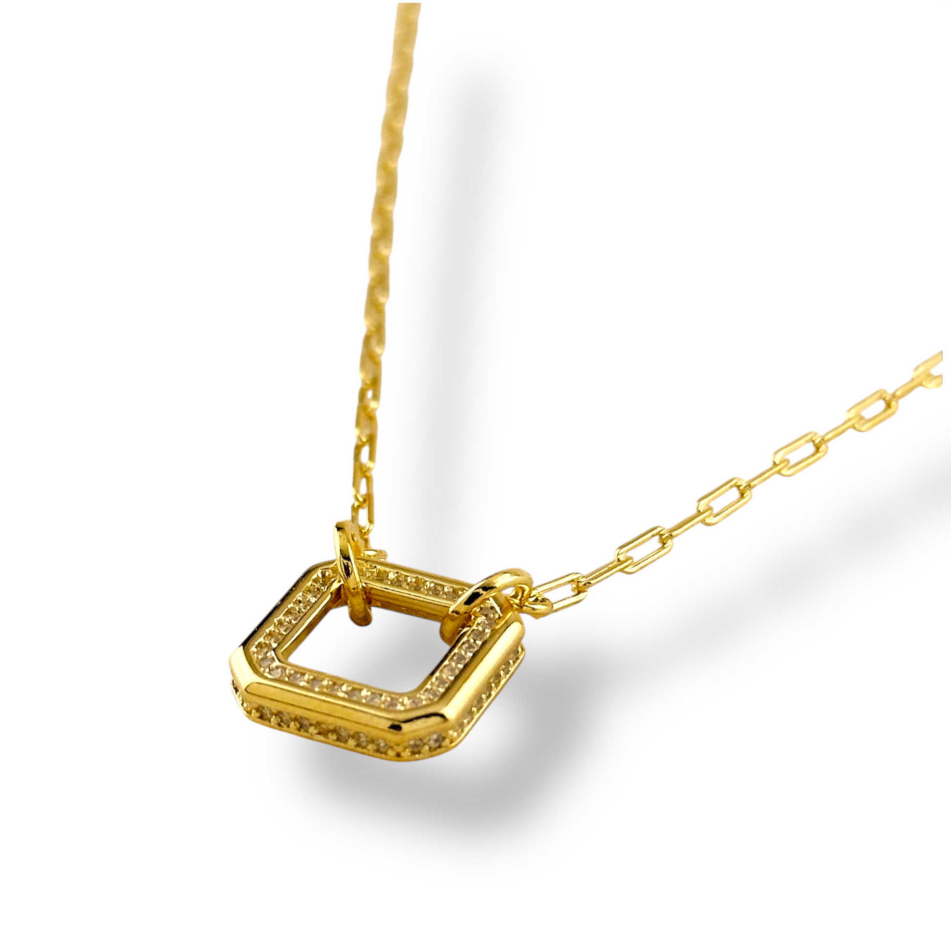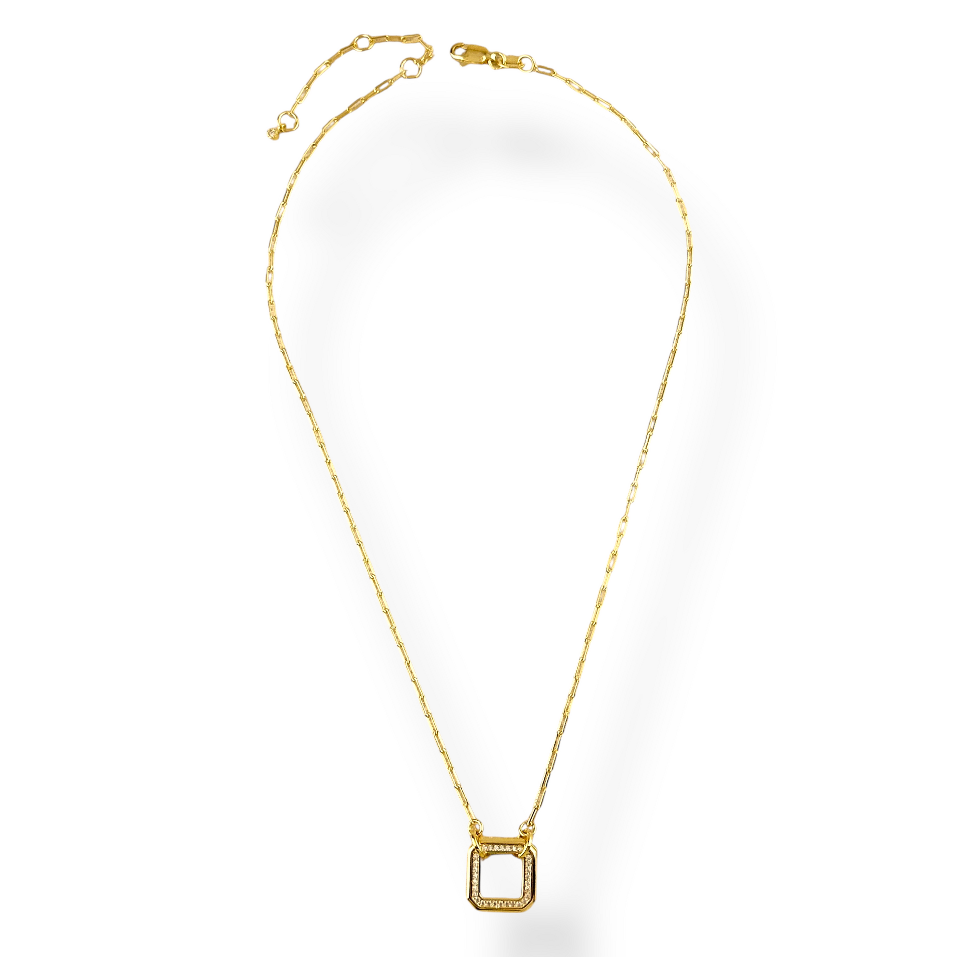 Shape that sparkles. This necklace features an open square pendant with clipped corners, lined with micro CZ stones all around the frame—geometric and glittery at the same time. The paperclip chain adds modern edge.