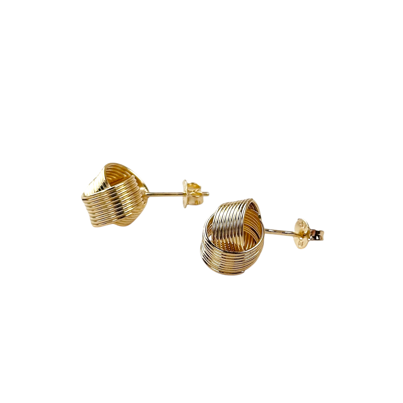 Intertwined elegance for your ears. These classic stud earrings feature delicate gold wires wrapped into a beautiful love knot—a timeless symbol of connection and unity. The intricate design catches light through every loop, adding texture and dimension to your look.