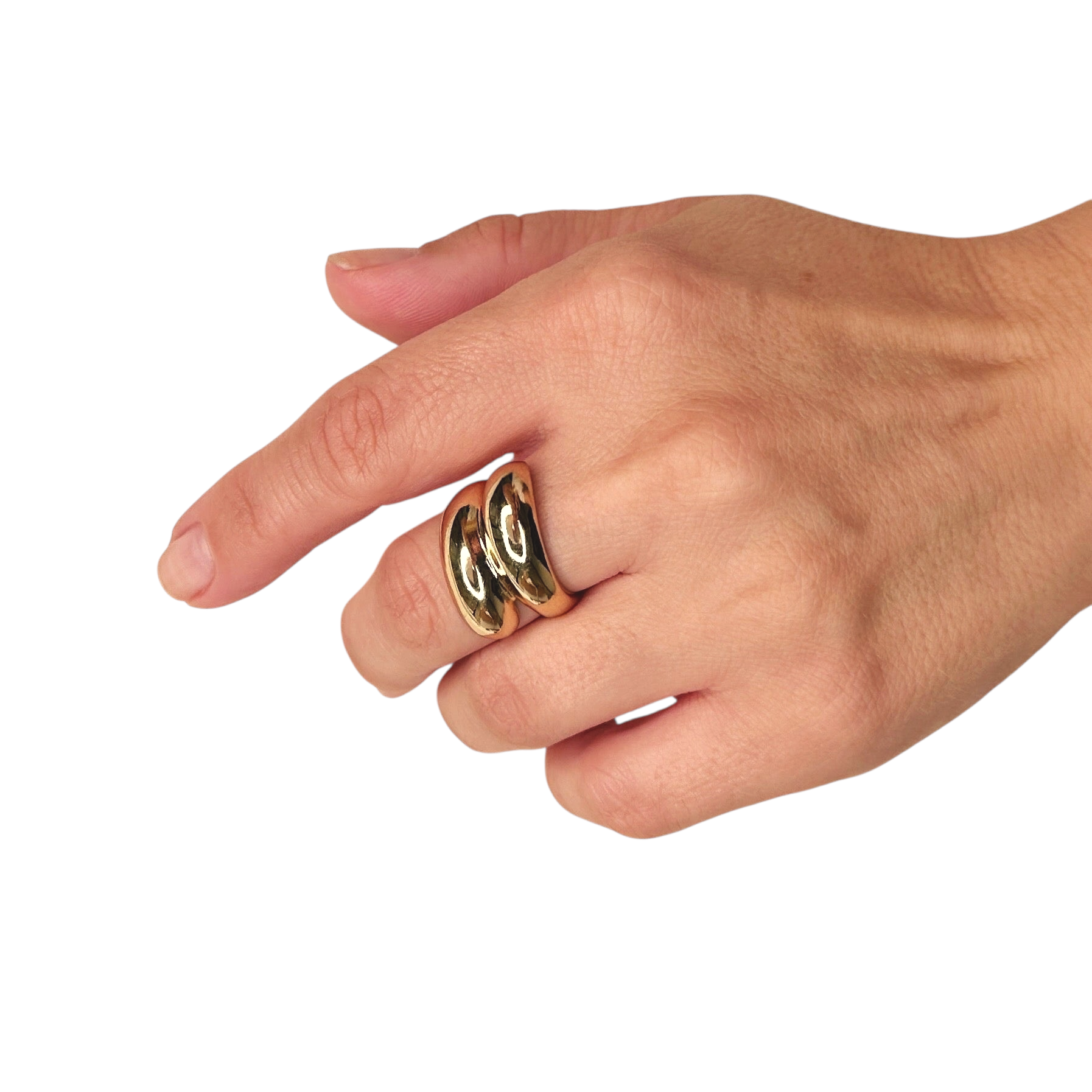 Break the rules of traditional rings. This bypass design flows organically around your finger with overlapping ends—modern, sculptural, and impossible to ignore. This is the ring that proves jewelry can be art.