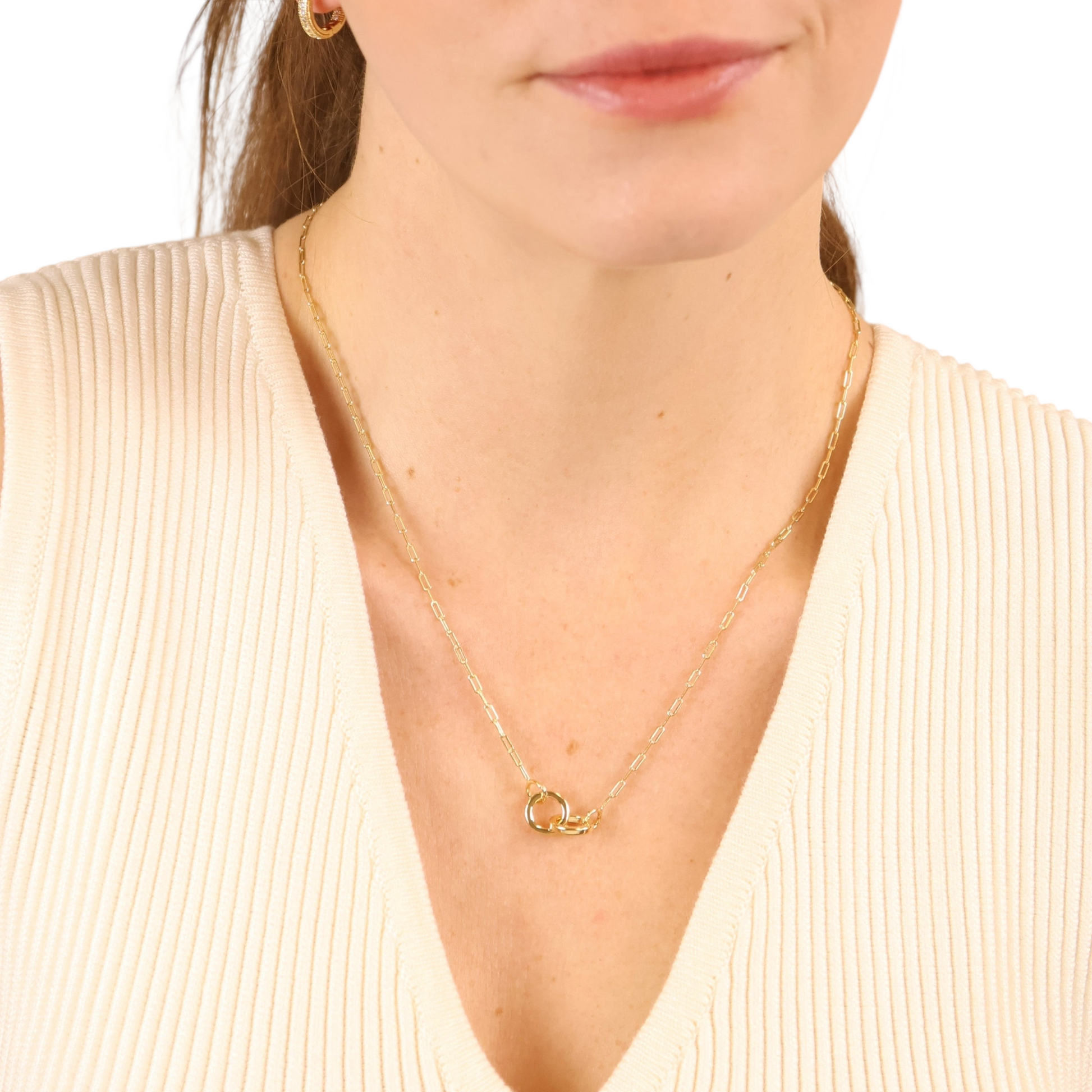 Two circles, one statement. This sleek necklace features two interlocking rings as centerpiece—both polished to perfection for a clean, minimalist look. Simple geometry with subtle shine that complements everything.